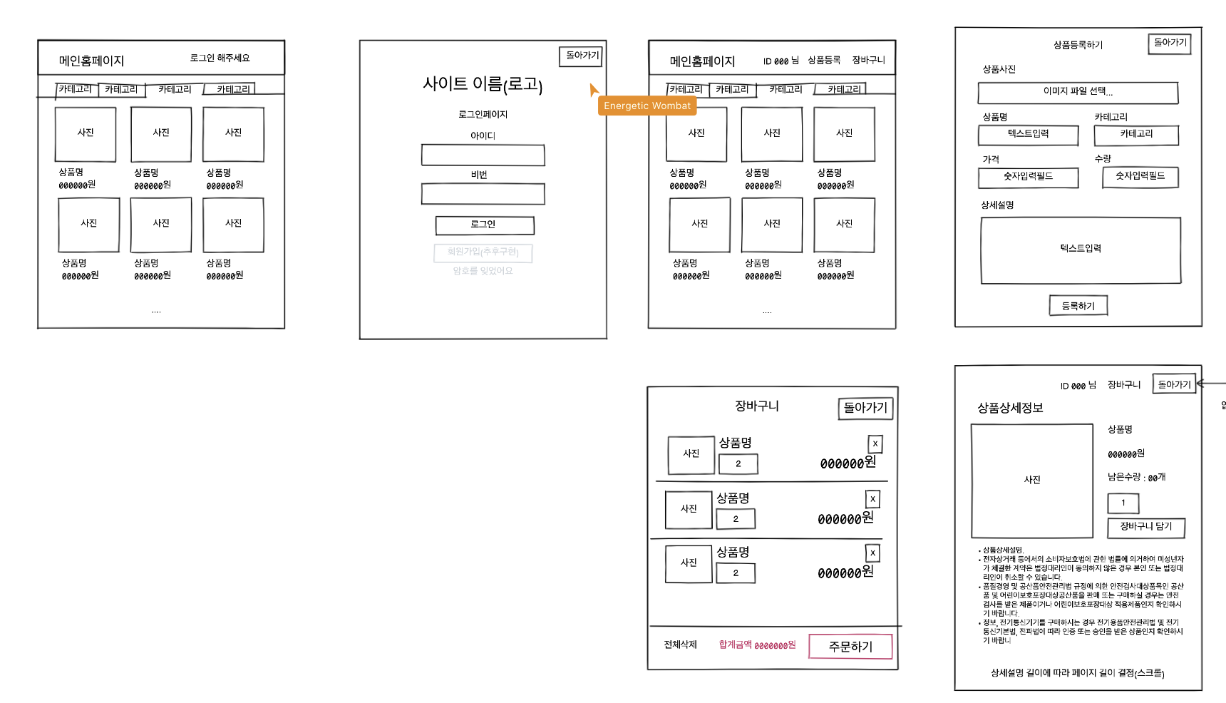 로그인페이지, 메인페이지, 장바구니, 상품등록, 상세상품 총 5page로 구성 되있습니다