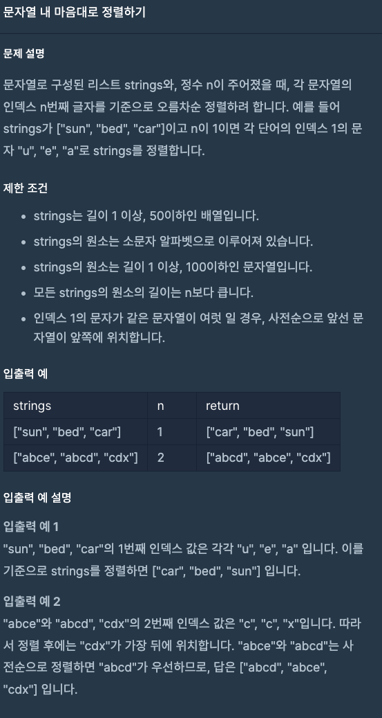 이번엔 해당 배열의 알파벳이 같을 경우 나머지 알파벳으로 사전순으로 배열해야 한다는 제한조건이 있다는걸 뒤늦게 봤다.