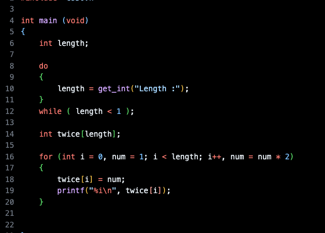 for (int i = 0, num = 1; i < length; i++, num = num * 2)