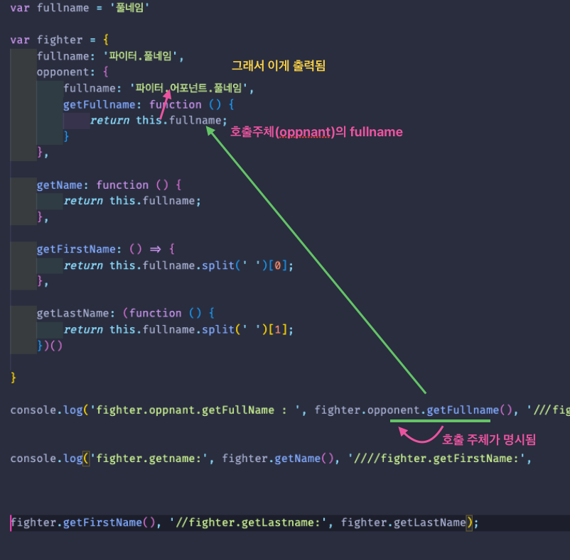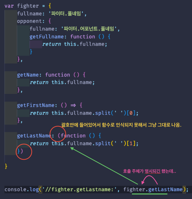 마지막 fighter.getLastName은 왜 undefined? (즉시실행함수)