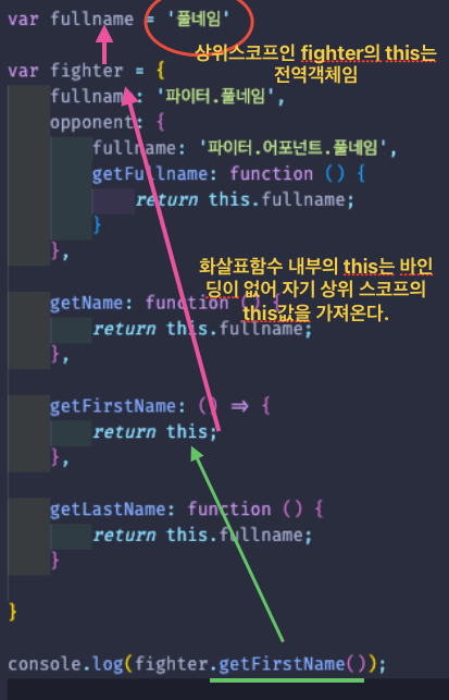 즉, 한단계 위 스코프의 this를 가리킨다고 생각하면 됨.