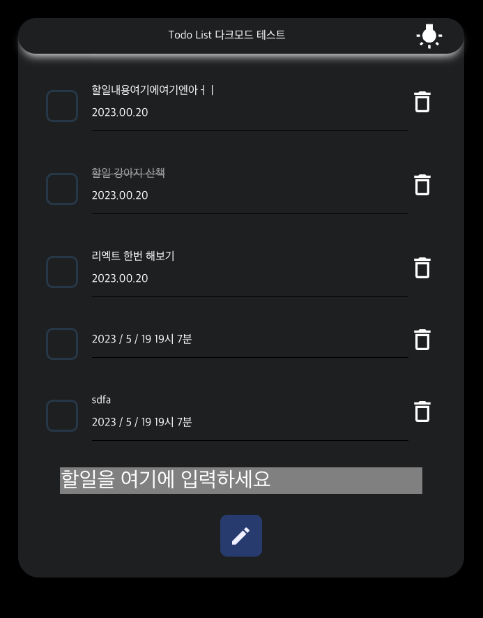 목차 scss(sass) 의 html data-theme속성을 toggle해서 구현했습니다. https://github.com/taehyunkim3/TODOList GitHub - taehyunkim3/TODOList: react react. Contribute to taehyunkim3/TODOList development by creating an account on GitHub. github.com https://todolist-pre.vercel.app/ React App todolist-pre.vercel.app 공유하기 게시글 관리 kth 저작자표시 비영리 변경금지 (새창열림) 목차 목차 닫기