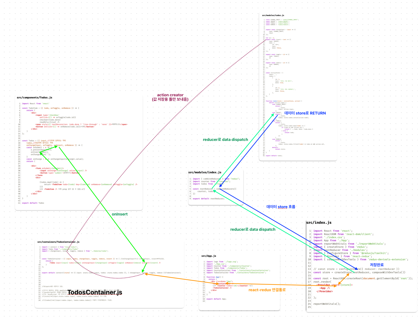 여기서 todosContainer.js는 connect함수가 아닌 useDispatch, useSelector를 사용하면 없어도 되고 한단계 단순해지지만,