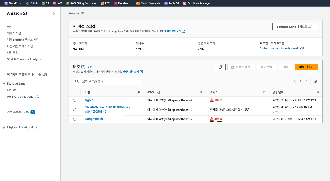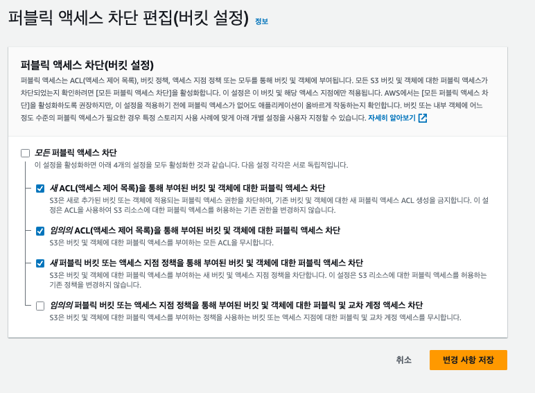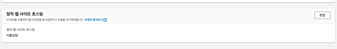 참고로 만들어진 버킷 속성에 있는 아래 옵션도, 우리는 cloudFront를 이용하기 때문에 사용하지 않는다.