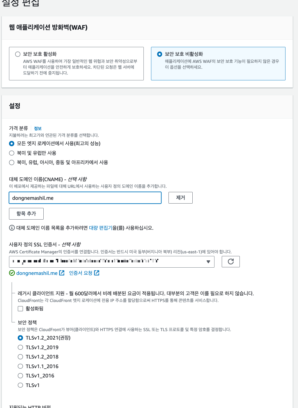 모르고 닫았으면, 그냥 CloudFront 에서 내가 아까 생성한 배포를 클릭해서 일반탭-설정부분-편집을 누르면 아래 화면이 뜬다.