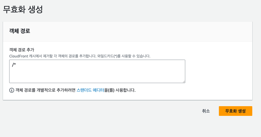 아래처럼 /* 입력하면, 업로드된 모든 파일에 대해 캐싱을 무효화하고, 변경사항을 바로 업데이트 한다.