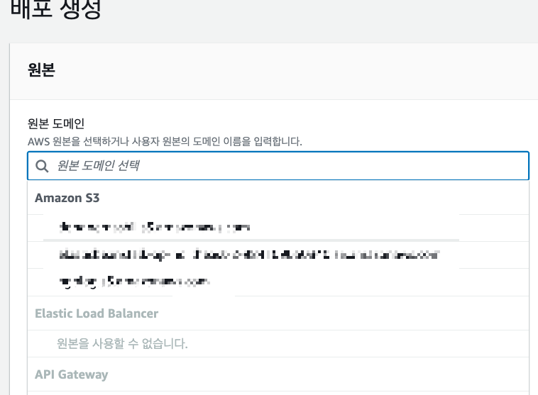 배포 생성에서 원본 도메인을 누르면 아까 만든 S3 버킷이 보인다. 선택한다.
