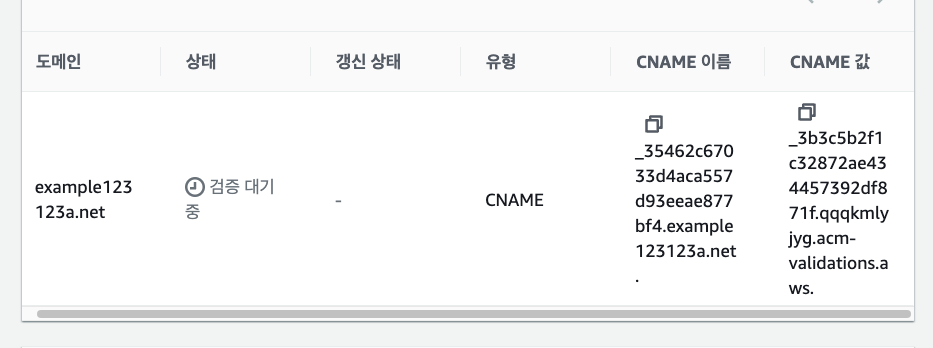 여기에 아까 인증서 생성에서 나왔던 CNAME을 사용할것이다. 본문 중간쯤 있었다.