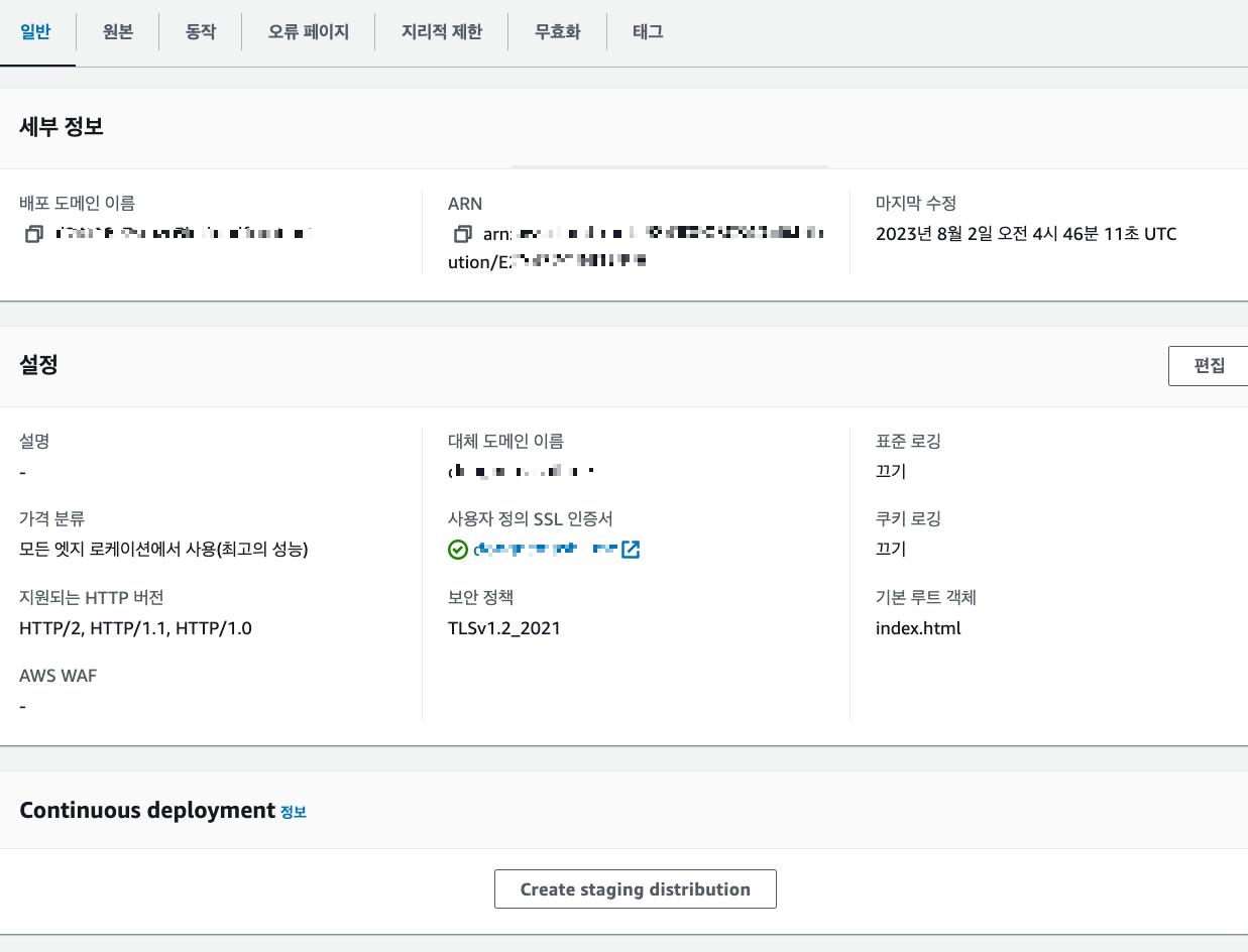 모르고 닫았으면, 그냥 CloudFront 에서 내가 아까 생성한 배포를 클릭해서 일반탭-설정부분-편집을 누르면 아래 화면이 뜬다.