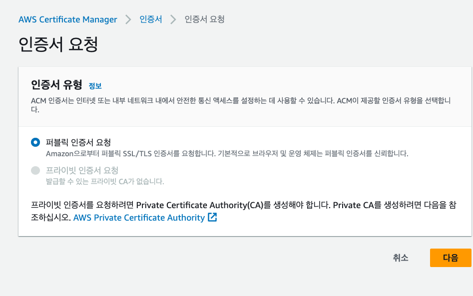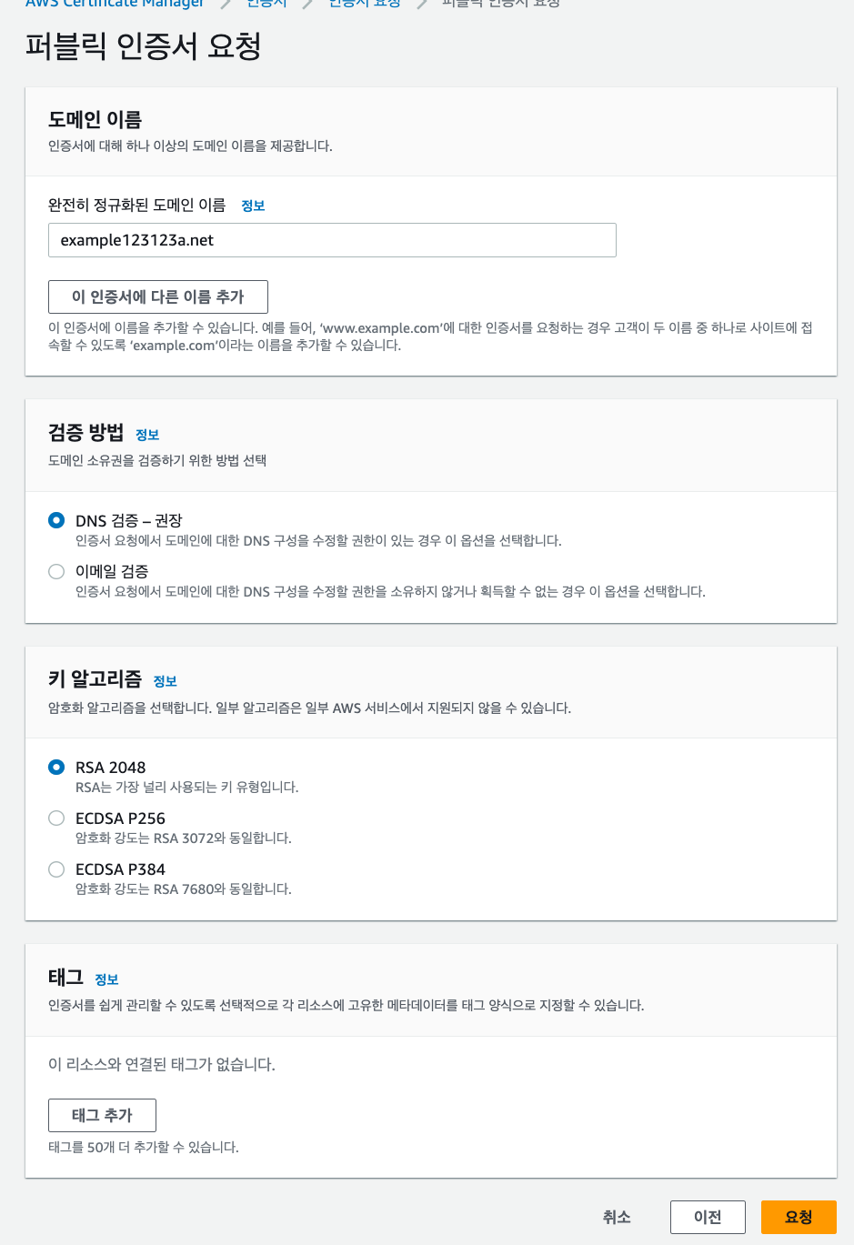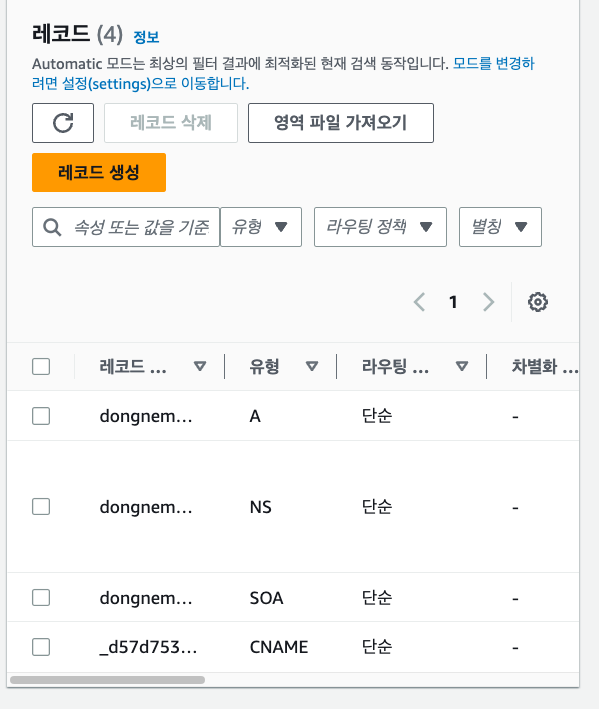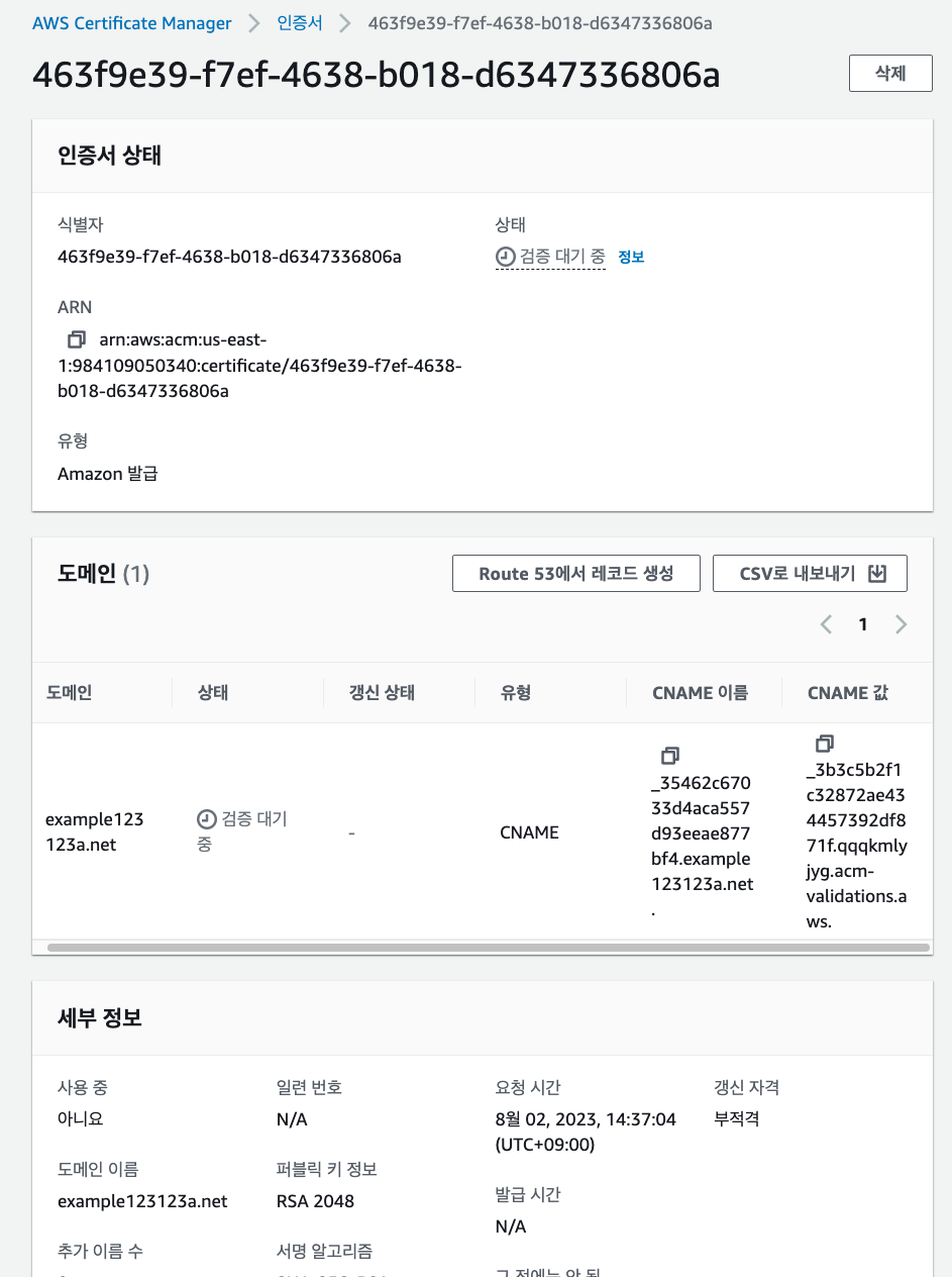 여기에 아까 인증서 생성에서 나왔던 CNAME을 사용할것이다. 본문 중간쯤 있었다.