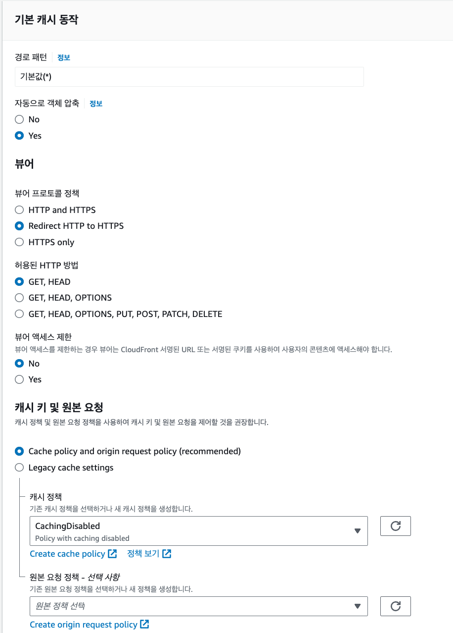 캐시 정책은 개발과정에서는 caching을 활성화하면 24시간동안 무효화하지 않으면 변경사항 적용이 안되기 때문에, 개발과정에서는 caching을 disabled하고, 서비스를 시작하면 optimized로 변경해도 된다. 이 캐싱 때문에 s3 엑세스 횟수를 매우 많이 줄여주기 때문이다.