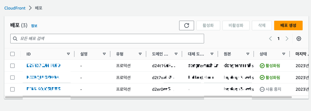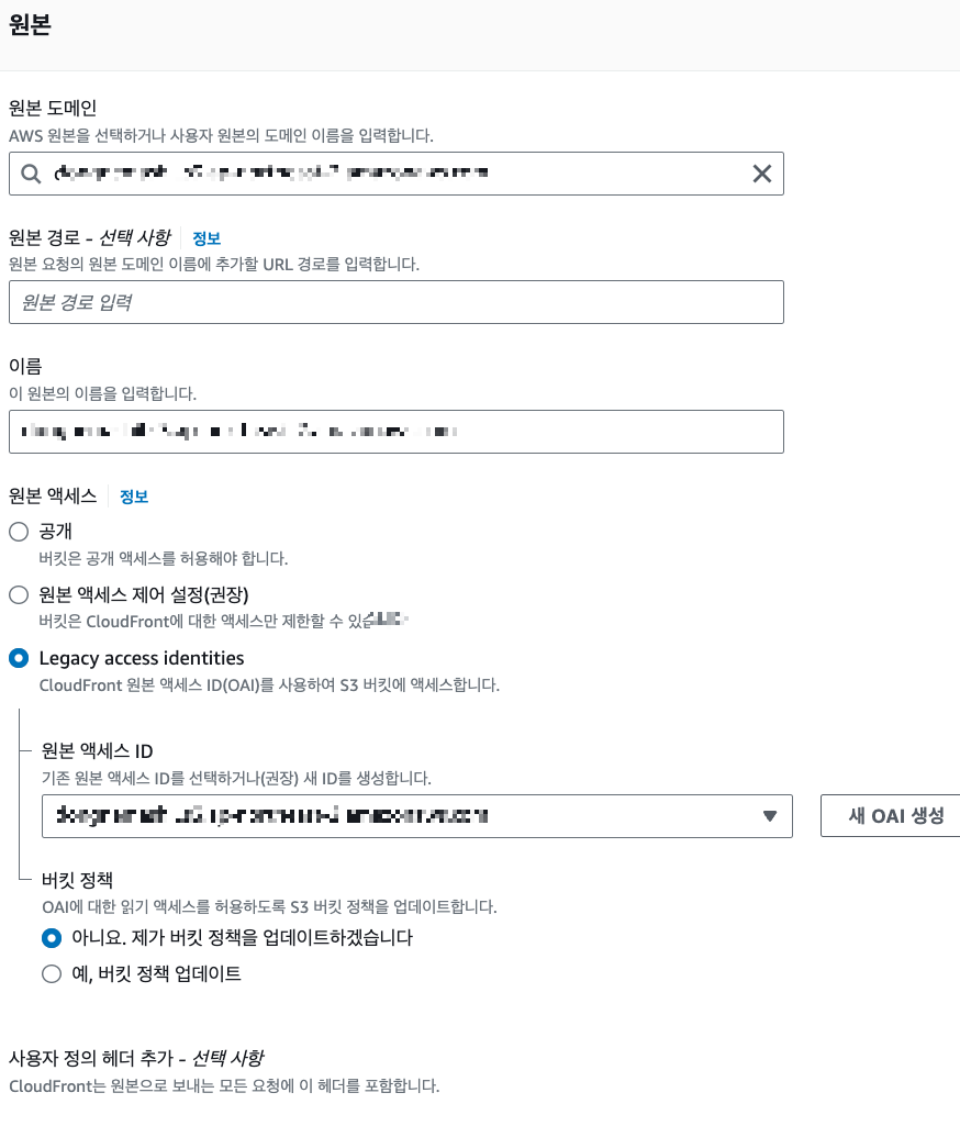 원본엑세스에서 OAI설정을 해야 퍼블릭엑세스가 막혀있는 S3 버킷에 접근할 수 있다.