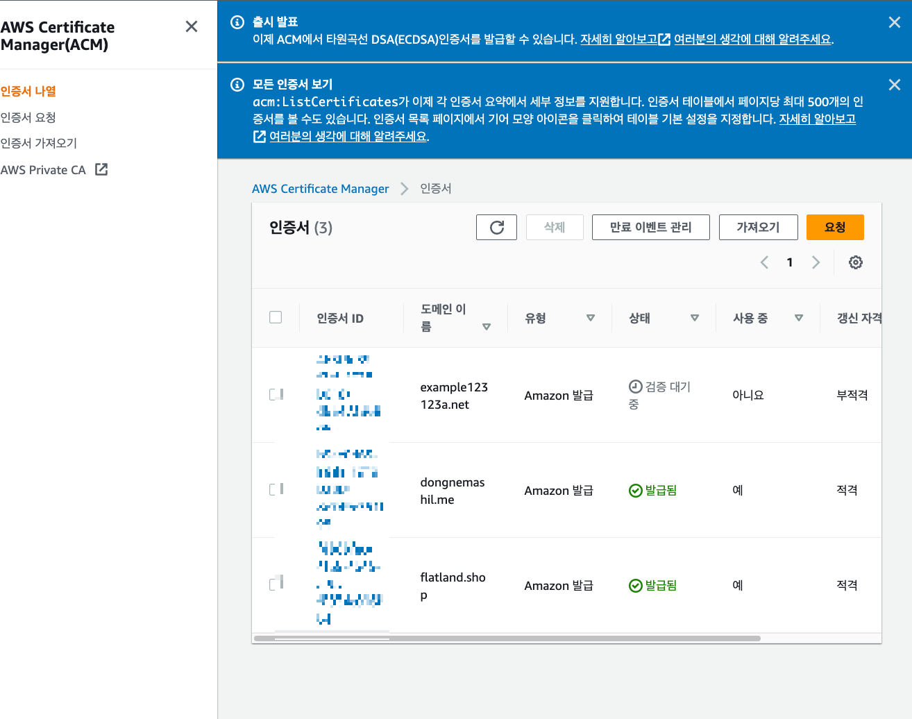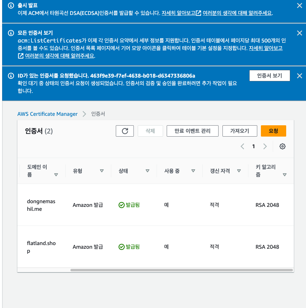 그리고 아마 AWS Certificate Mamager에서 새로고침 버튼을 누르다보면 30분 이내에 발급됨으로 바뀐다.