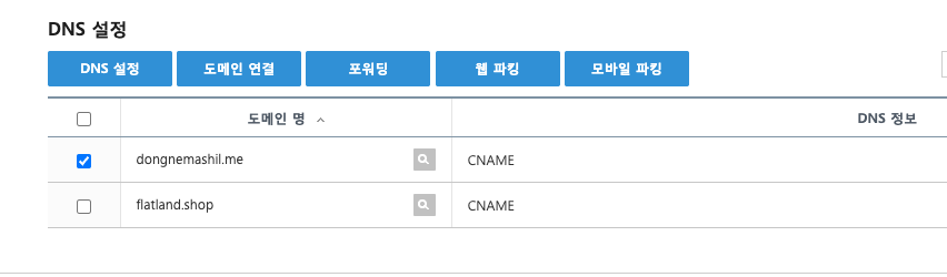 그럼 DNS관리사이트로 이동하는데, 원하는 도메인을 체크하고 DNS 설정을 누른다.
