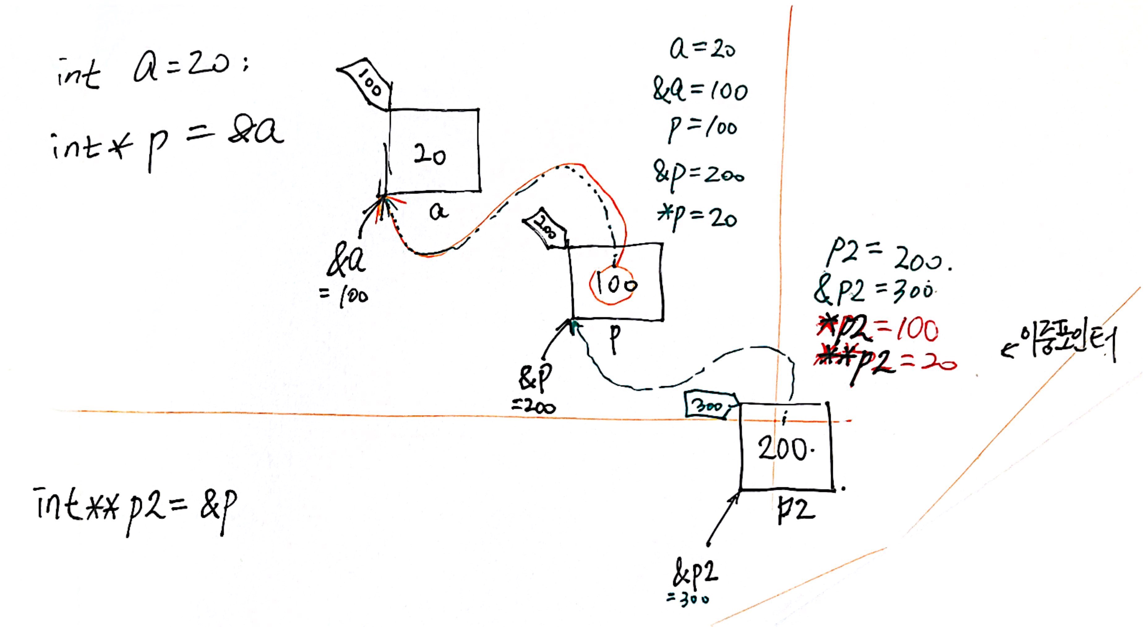 *p2 라고 하면 *p2 = 100 (첫단계 주소값)