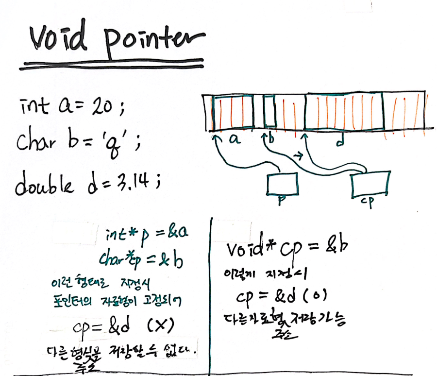 목차 모든 포인터는 4byte의 크기를 가지므로, void포인터라는 형태가 없는 포인터도 사용이 가능하다. void pointer는 여러가지 자료형에 상관없이 저장이 가능하나, 컴퓨터가 그 자료를 읽어오기 위해서 필요한 데이터의 크기값(int 4byte, char 1byte ...)이 없어서 호출시 해당 자료형을 알려주어야 호출이 가능하다. *(char*)p = 형식으로 표기한다. 호출시 자료형을 지정하지 않으면 불러울 수 없다. 공유하기 게시글 관리 kth 저작자표시 비영리 변경금지 (새창열림) 목차 목차 닫기