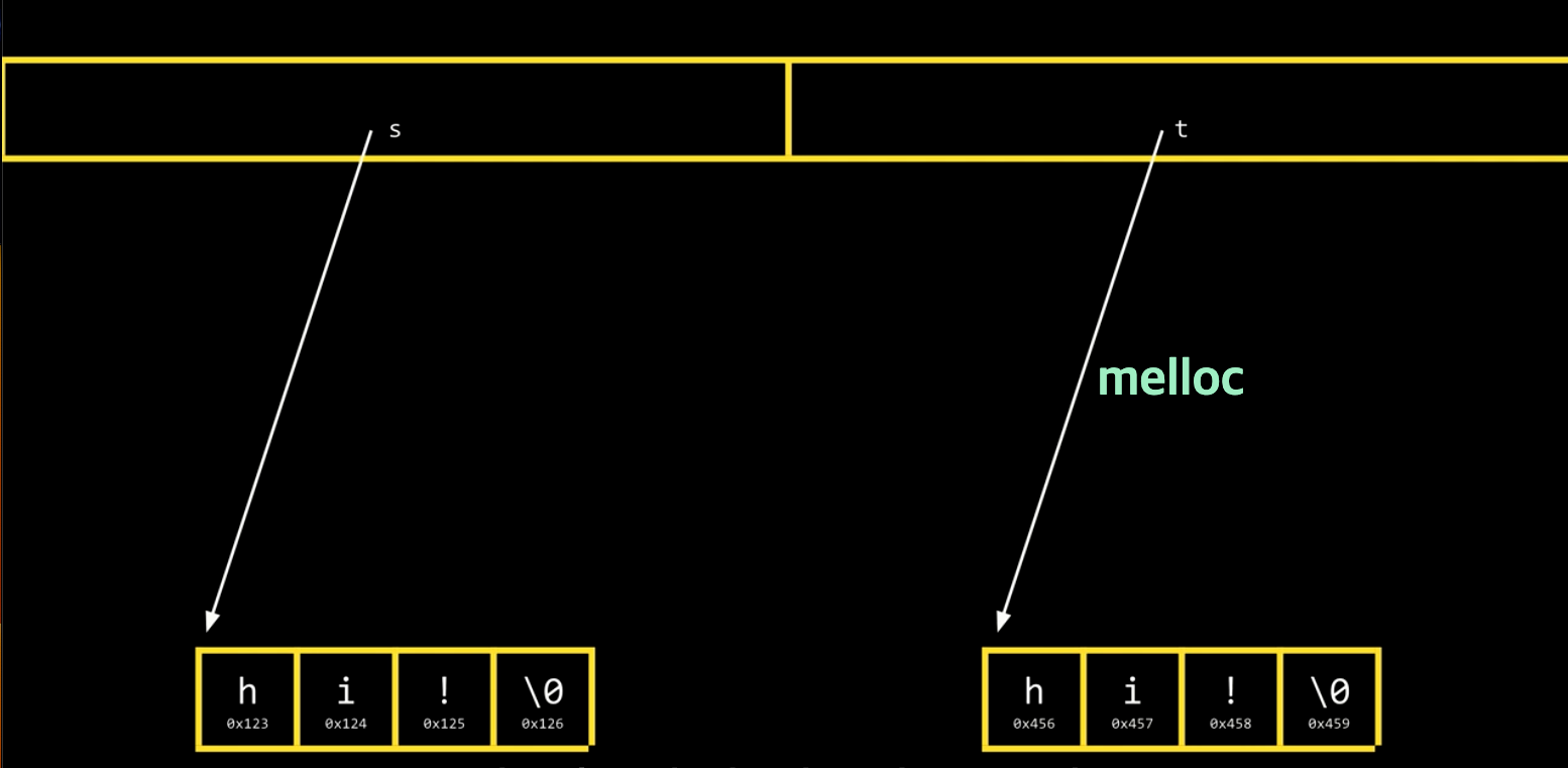 s = t 와 같이 변수를 복사하면, 값이 복사되는게 아니라 첫 주소만 복사되며, 실제 값은 여전히 하나이다.