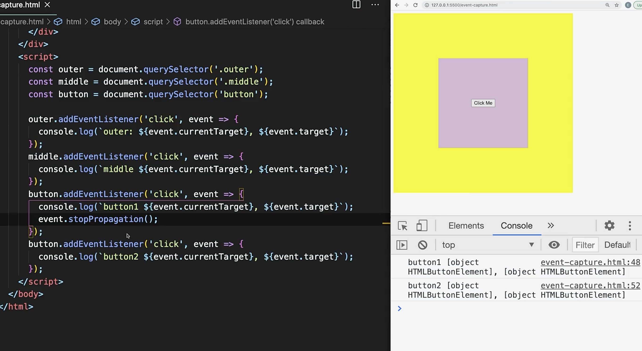 버튼을 클릭하면 bubbling up이 되어 middle, outer까지 클릭 이벤트가 실행됨.